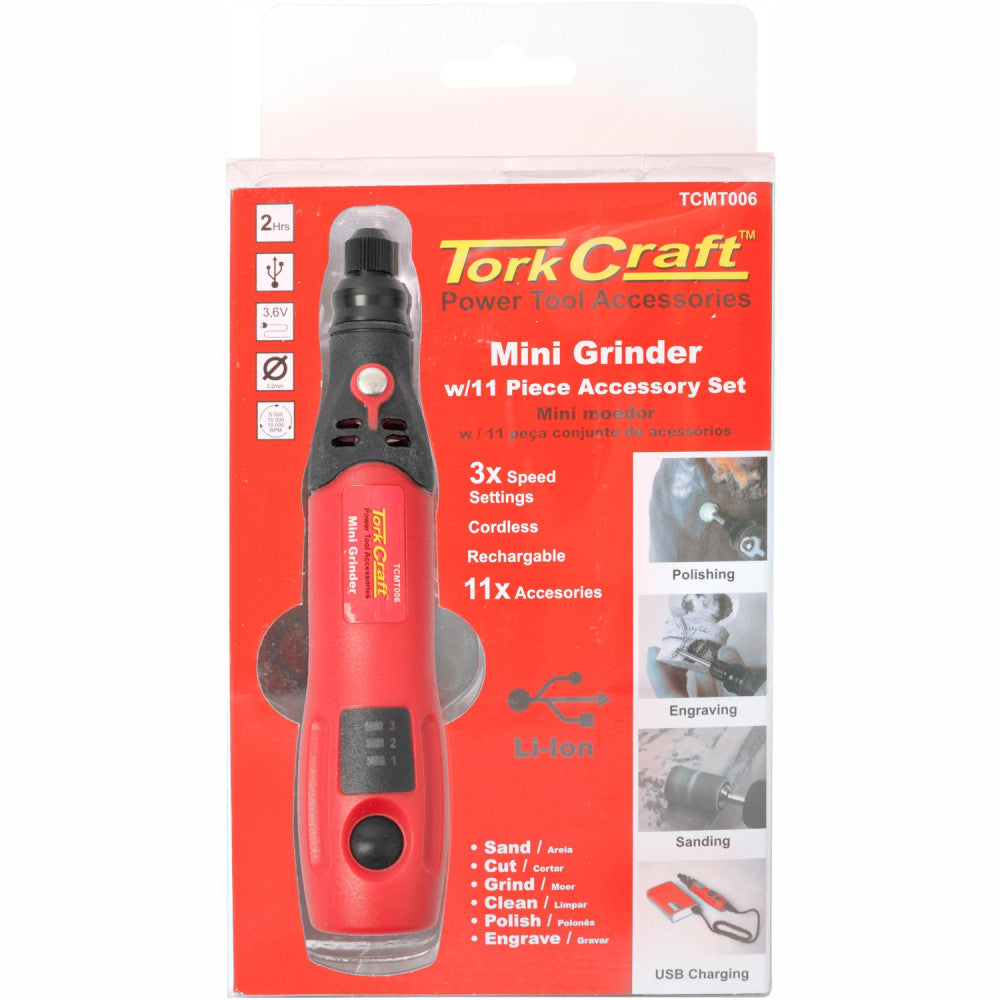 The Tork Craft Mini Tool Set (model TCMT006) brings portable power and flexibility to your workshop, hobby bench or job-site. With a 3.7 V Li-ion battery and USB recharge capability you can take this tool almost anywhere without needing mains wiring.